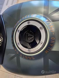 Moto originale, completa di personalizzazione specifica realizzata da Triumph Milano/South Garage, specchietti bar-end, cambio quickshifter (cambio elettronico, accessorio originale Triumph), cupolino, presa usb, griglia radiatore, tamponi paraserbatoio.