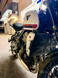 Vendo per inutilizzo e cambio progetto Triumph Trident 660 Crystal White, 9300 Km, due proprietari. Bollo appena pagato. ABS anteriore e posteriore, traction control con 2 mappature (road e rain). Optional originali Triumph: - Cupolino protettivo degli strumenti black - Specchietti bar-end - Quickshifter up/down (cambio elettronico bidirezionale) - Paraserbatoio - Modulo bluetooth - Maniglie passeggero - Protezione forcelle Tagliandi programmati tutti eseguiti in concessionaria Triumph, con libretto a certificarli. Prossimo tagliando 08/2026. Accessori installati: -Filtro aria sportivo Bmc - Centralina - Scarico aperto - Multispacer - Tappo serbatorio - Tappi CNC freno ant - Griglia protezione radiatore - Nottolini cavalletto posteriore - Protezione frizione GB Racing - Fascette cavi - Tappo olio cnc - Tappi specchi - Tappi liquido freno e valvole ruote - Logo ruota posteriore - coprisella Tenuta in garage e su cavalletti anteriori e posteriori. Libretto di uso e manutenzione e doppie chiavi presenti. No scambi, offerte assurde e no perditempo.