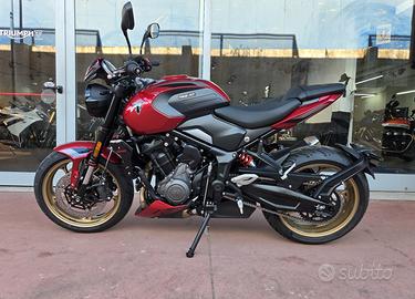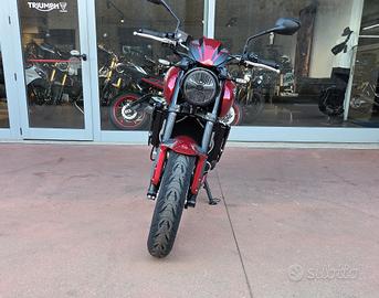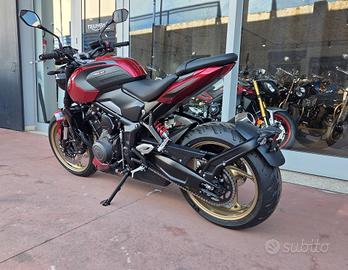 Triumph Trident 800 Colore Carnival Red In Pronta Consegna Possibilità di consegna in tutta Italia Finanziamenti a Tassi Agevolati Specifiche Tecniche Motore e Trasmissione Motore Raffreddato a liquido, 12 valvole, doppio albero a camme in testa, 3 cilindri in linea Cilindrata 798 cc Alesaggio 78 mm Corsa 55,7 mm Rapporto di compressione 13.2:1 Potenza Massima (CE) 115 CV (84,6 kW) a 10.750 giri/min. Coppia Massima 84 Nm @ 8,500 rpm Sistema di Iniezione elettronica sequenziale multipoint con SAI con controllo elettronico dell'acceleratore Impianto di scarico 3 in 1 in acciaio inox con silenziatore laterale in acciaio inox Trasmissione finale Catena X-ring Frizione Multidisco in bagno d'olio, antisaltellamento, assistita Cambio 6 rapporti Telaio Telaio perimetrale in acciaio tubolare Forcellone Acciaio saldato, a doppio lato Ruota Anteriore In lega di alluminio, 5 razze, 17 x 3,5" Ruota Posteriore In lega di alluminio, 5 razze, 17 x 5,5" Pneumatico Anteriore 120/70 R 17 Pneumatico Posteriore 180/55 R 17 Sospensione Anteriore Forcella rovesciata Showa BP-SFF da 41 mm, con regolazione di compressione e ritorno, escursione ruota 120 mm Sospensione Posteriore Ammortizzatore posteriore Showa RSU con regolazione del precarico e del ritorno, escursione ruota di 130 mm Freno Anteriore Doppio disco flottante da 310 mm, pinze radiali a 4 pistoncini, OCABS Freno Posteriore Disco fisso singolo da 220 mm, pinza flottante a singolo pistoncino, OCABS Strumentazione e Funzioni Strumentazione multifunzione LCD con display TFT a colori integrato Dimensioni e Peso Larghezza Manubrio 815 mm Altezza Senza Specchietti 1088 mm Altezza Sella 810 mm Interasse 1402 mm Angolo di Inclinazione 24,5 ° Avancorsa 108 mm Peso in ordine di marcia 198 kg Capacità Serbatoio 14 l Consumo di carburante 4,7 l/100km Co2 standard Euro 5+