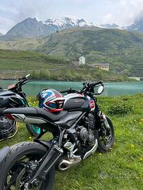 Vendo Trident Triple Tribute 660 del 2024 depotenziata a libretto. Edizione limitata con grafiche. La moto ha 5500km ed é in garanzia fino a luglio 2026. Tagliandata regolarmente in officina Triumph. Tenuta sempre in garage e coperta. Pari al nuovo. Gomme al 70%. Cedo insieme alla moto il comando gas per il depotenziamento. Prezzo poco trattabile dopo aver visionato la moto.