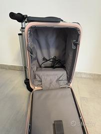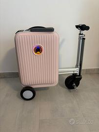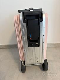 Il trolley nella foto è un modello particolare e innovativo che combina le funzionalità di una valigia con quelle di un monopattino o veicolo elettrico da trasporto personale.
