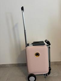 * Sistema di guida pieghevole: C'è un manubrio in metallo estensibile collegato alla parte anteriore, suggerendo che il trolley possa essere utilizzato come una **valigia elettrica da cavalcare**, simile a un piccolo scooter.