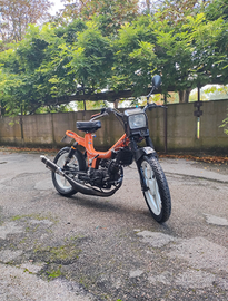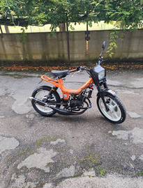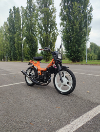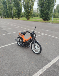 Motore Minarelli rv4 completamente revisionato e originale a liquido, mascherina anteriore fifty hf, silenziatore Giannelli in carbonio, ammortizzatori posteriori a gas nuovi, forcelle anteriori fifty con freno a disco revisionate e indurite, completamente riverniciato arancione a polvere e cerchi in lega bianchi, impianto fari a led sotto batteria, gomme nuove.
