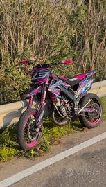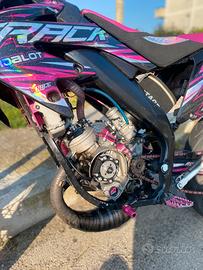 Vent 50 2021 moto rifatta completamente da zero, è stato verniciato telaio e forcellone di nero, è sempre stata trattata bene ed è sempre in perfette condizioni. sono state revisionate le forcelle, cambiato cuscinetti cerchio anteriore e posteriore monta: -maxi kit tpr 86 -pompa dell' acqua maggiorata tpr -collettore most -pacco lamellare vforce3 originale con lamelle stage6 -carburatore 30 vhsh dell' orto -alza pacco krm -krm 90/100 -pvl bidalot 2011 50g -filtro stage6 double layer -frizione krm molle rosse -secondo radiatore ciclistica: -disco anteriore 320mm -pinza rpm anteriore -pompa maggiorata anteriore adelin -pinza rpm posteriore -rapporti 14/60 sono stati aggiunti altri pezzi d' estetica come: kit completo grafiche 100% personalizzate, grafiche cerchi, grafiche forcelle, sella 100%personalizzata da martin graphic, leva freno ant most, boccetta olio freno most, ferma bielletta most, manubrio most 28mm, copri pompa most, copri radiatori most, gas rapido terzo, guaina cavo gas, molle scarico in titanio, catena most, leva cambio krm, dissipatore di calore krm, paracolpi krm, stacca massa krm; sono stati verniciati alcuni pezzi come ammortizzatore, leva freno posteriore, pedane piedi e sono state cambiate mascherina e parafango anteriore con una piatta yz 125 e un parafango acerbis supermoto evolution. sono stati raccordati i carter e cilindro lasciato stock blocco completo con 50h totali NO SCAMBIO NO PERDITEMPO NO SENZA SOLDI per info questo è il numero: 3501871165