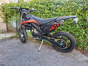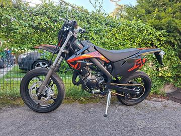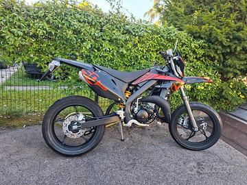 Monocilindrico Minarelli, 2 tempi, raffreddato a liquido- Avviamento Kick Starter Cambio 6 rapporti -Telaio Perimetrale in acciaio Vent, doppia culla con posteriore scomponibile- Forcellone Acciaio Sospensione anteriore Forcella idraulica con stelo 37 mm -Sospensione posteriore Monoammortizzatore idraulico- Freno anteriore Disco Wave 290 mm con pinza flottante a 2 pistoncini- Freno posteriore Disco Wave 220 mm con pinza flottante -Altezza sella 875 mm -Peso a secco 89,5 kg