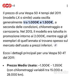 Vendo vespa 50 quattro tempi a benzina, tenuta bene, unico proprietario solo 5500 chilometri. La vespa ha uno specchietto, parabrezza originale Piaggio. Doppia messa in moto a pedale ed elettrica. Vespa 50 modello quattro valvole. Il passaggio a carico del compratore