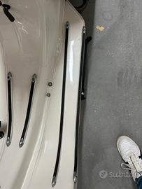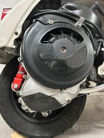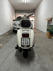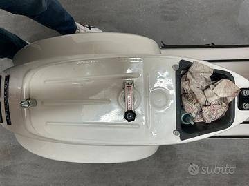 Vespa 50 special anno 04/1983, 4 marce, sigla motore V5A4M con carter gemelli. Restaurata con colore originale Piaggio "biancospino" codice 715. Vespa rinforzata con classico tondino di ferro da 6 mm intorno alla carrozzeria. Monta faro a led ant e post perfettamente funzionanti con anabbaglianti e abbaglianti all anteriore e doppio stop posteriore, kit termico parmakit challenger d.57 in alluminio aspirato al cilindro, carburatore 24 vhsh dell orto, pacco lamellare V-force 3 della tassinari, ventola alluminio cnc della fabbri, marmitta mdm marri calcolata al motore, pignone e corona polini 27/69 con cluster della parmakit quarta corta, crociera parmakit modello al nicasil, albero motore vmc spalle piene corsa 51. Preciso che il cilindro è stato elaborato da noto elaboratore di zona cosi come tutte le regolazione effettuate da elaboratore. Come ciclistica monta sosp anteriori della yss, posteriore della carbone (entrambi regolabili), gomme nuove della dunlop, cerchio posteriore della sip tubeless non scomponibile, forcella anteriore proveniente dallo zip con freno a disco, disco a margherita tutto fatto su misura. Sella biposto. Dispongo di tutte le componenti originali. Visibile in zona san prisco e limitrofe. Prezzo poco trattabile dopo visione.