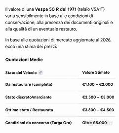 Salve a tutti vendo permuto vespa 50n restaurata 6 anni fa condizioni buone no rugine solo qualche righetta dovuta al tempo del resto tutto nuovo le uniche cose da sistemare cordicella cambio che sicuramente si e mollata e qualche altra fesseria monta frizione nuova con denti ingranaggio denti dritti 100cc dr marmitta polini ancora da rodare montati e mai usati,valuto permuta o scambio no perditempo