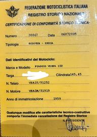 Vespa epoca anno 1959, modello vbn1t 150. Targa oro iscritta registro storico nazionale. Libretto originale e targa firenze. No permute. Ritiro e passaggio a carico acquirente. Revisione da fare.