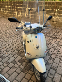 Vespa et4 125 del 2001 con 33400 km. Ultimo di vari proprietari, vendo solo per passaggio a cilindrata superiore. Appena revisionata (revisione valida fino a maggio 2027). Eseguiti vari lavori a maggio: cambio candele, cambio olio, sostituzione rulli e cinghia, cambio filtri, sostituzione freno posteriore. Marmitta (originale) nuova, cambiata dal precedente proprietario. Monta variatore non originale (ottimo spunto in accelerazione). Consumi bassi.