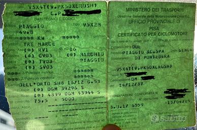 Vespa Piaggio del 1989 con libretto originale, perfettamente funzionante disponibile video su richiesta , tenuta sempre in garage, monta motore potenziato 4 marce rifatto ex novo nel 1996 usata poi solo 2 anni fino al '98.
