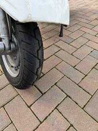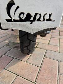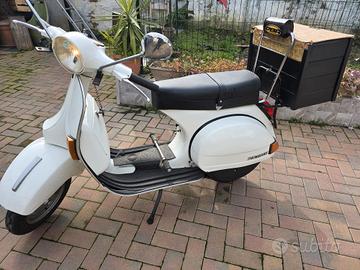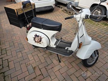 vespa px 125 ristrutturata, con piccoli difetti di carrozzeria, dotata di portapacchi posteriore e anteriore con parabrezza