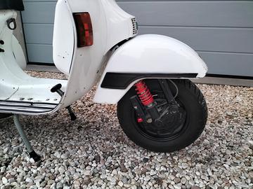 Vespa px 125 e anno 1982, motore con polini 177 in ghisa, albero polini corsa 60, accensione e volano polini, carburatore pinasco si24, frizione pinasco, marmitta polini serpentone. Sospensione anteriore e posteriore bitubo. Ha difetti di carrozzeria. Contatti dopo le 18.