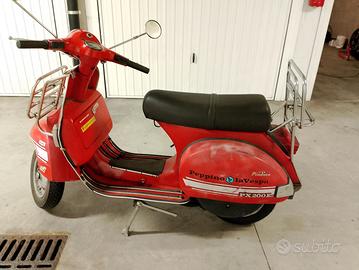 Vespa px 200 e anno 1982 senza miscelatore. Carrozzeria sana verniciato a bomboletta,monta gruppo termico Pinasco Sport 215, scarico Siproad 2.0, ammortizzatori Carbone regolabili, centralina a 5 poli con portabatteria e presa usb nel cassettino, cerchi tubeless compreso quello di scorta, cavalletto laterale,gemme bianche,faro e sella MY,portapacchi anteriore e posteriore, gomme sia estive che invernali. Scambio con vespa GTS oppure modello large senza frecce. La vespa è perfettamente marciante e funzionante