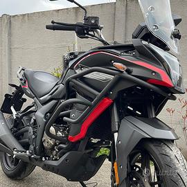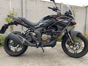 Voge Valico 300 DS con motore monocilindrico 4t. Euro5 raffreddato a liquido, cambio 6 marce, ruote da "17, forcella upside-down ø 35 mm. freni a disco ant. singolo ø 300 mm. post. ø 220 mm con sistema ABS a doppio canale, peso 159 kg. serbatoio lt.16, consumi 30km/l 21,0 kW (28,6 CV) velocità max 125km/h altezza sella 810 mm. omologata 2 posti a sedere, incluso tris valigie. Garanzia ufficiale VOGE fino a giugno 2026.Prezzo Euro 2.900,00 escluso passaggio di proprietà Euro 200,00