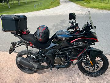 La moto è dotata di para motore, il tris di valigie originali Voge con i relativi telaietti, faretti a led che si azionano col comando sul manubrio, leve freno e frizione regolabili (ho anche le originali) e tanto altro ancora.