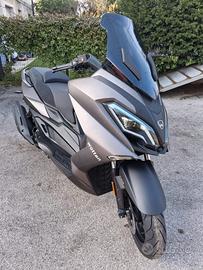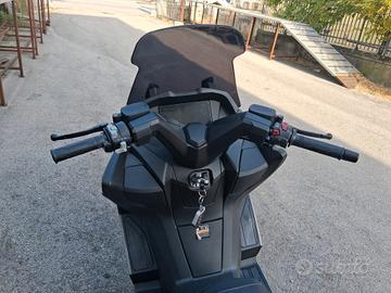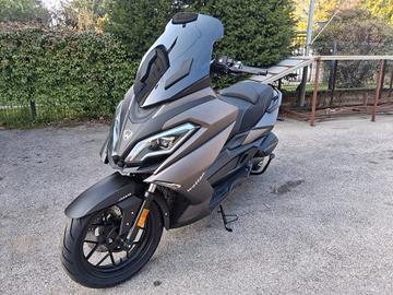 comfort di una moto da turismo con l'agilità di uno scooter, unendo tecnologia, design e prestazioni in un'unica, straordinaria, con un'erogazione fluida, stabile ed efficiente. Il telaio tubolare in acciaio ottimizza la distribuzione dei pesi e migliora l'agilità, mentre la sospensione posteriore regolabile nel precarico, con doppio ammortizzatore e serbatoio del gas separato, garantisce precisione e comfort di guida. La frenata, potenziata con ABS a doppio canale e pinza anteriore radiale a quattro pistoncini, assicura controllo e sicurezza in ogni situazione. dotazione tecnologica: schermo TFT touch da 7" con Screen Mirroring, avviamento senza chiave, telecamera frontale integrata, comandi retroilluminati, manopole riscaldabili e una notevole capacità di carico sotto la sella a doppia altezza con supporto lombare.