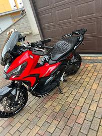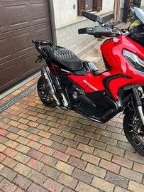 Vendo Honda xadv 750 versione 2024 rosso Nero personalizzato su barre piastra bauletto sella personalizzata romboidale con cuciture rosse bauletto wireless con poggia schiena passeggerò personalizzato come la sella, tubi laterali anticaduta con preparazione stage 1 da officina Aloia con scarico completo MIVV carbon