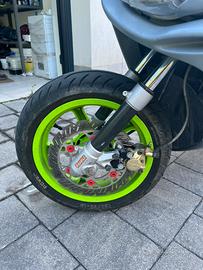 Sono stati montati dei miglioramenti alla ciclistica: disco e pinza brembo anteriore da 260mm, posteriore da 210mm, ammortizzatore malossi bianco e rosso, gas rapido tommaselli, pompa dell'acqua maggiorata stage 6 e pneumatico michelin posteriore nuovo (0km ). Carburatore da 17.5 , trasmissione completa malossi . Per quanto riguarda l'estetica monta il sotto codino della bcd nero e rosso ,il portatarga pieghevole e cavalletto laterale . La pompa dell'acqua é stata appena revisionata.