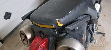riverniciata, frecce sequenziali a led con tanto di relè regolatore, gommata al 90%, pasticche freni e dischi nuovi, supporto targa nuovo, parastrappi ruota posteriore nuovi, catena pignone e corona nuovi, manopole barracuda, manubrio rizoma, qualche segno di usura sul sellino posteriore, blocchetto manomesso per tentato furto ma funzionante. vendo per inutilizzo. km circa 60.000 casa ufficio.
