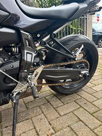 Come da titolo vendo stupenda YAMAHA MT 07, anno fine 2014. Moto Depotenziata quindi guidabile con patente A2. Essendo la prima versione, si può riportare a potenza piena rimuovendo un blocco sull'acceleratore. Il colore è molto particolare, sembra nera ma é viola scuro. La moto presenta all'attivo 30.000 km. Revisione effettuata in data 31.07.2025. Di recente sono state sostituite le gomme con Bridgestone S21R, pasticche freni, kit trasmissione e revisionate le forcelle anteriori. Come accessori estetici monta copricarter effetto carbonio, specchietti end bar, portatarga regolabile, tappi serbatoio freno con logo MT, griglia protezione radiatore, leve aftermarket, cupolino e tamponi ruota. Tagliando fatto da poco. Moto pronta all'uso, molto divertente. Per ulteriori informazioni non esitate a contattarmi. Bollo appena pagato.