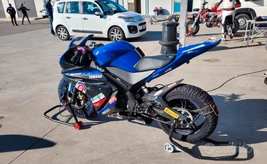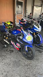 Vendo Yamaha r125 cup da pista, con fattura Yamaha, non immatricolata, solo pista quindi non necessita di passaggio di proprietà, la moto è una Cup quindi con tutti i requisiti Fmi, monta motore malossi 180, filtro sportivo, scarico completo Akrapovic, radiatore maggiorato, mono regolabile, sospensioni preparate, carene Vtr, sensore temp Koso, pedane regolabili Valter Moto, centralina Rapid Bike, paracarter R&G, motore con circa 1000 km, tagliando appena fatto con Motul V300, insieme alla moto coppia di cerchi con pneumatici Rain nuovi, corone di scorta, frizione nuova ancora da montare, serbatoi, carene, semi manubri, corpo farfallato, e tantissimi ricambi.