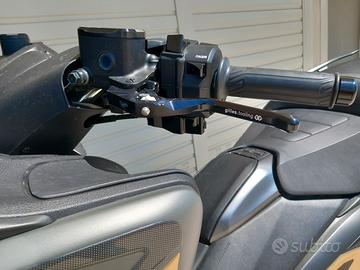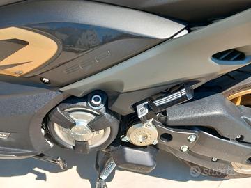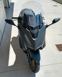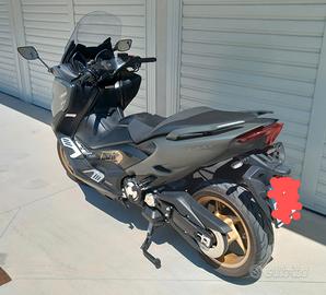 TMAX Tech Max 2021 Tech Kamo Il Tech Max ha di serie parabrezza elettrico, sella e manopole riscaldabili, mappe motore e blocco elettronico del cavalletto centrale, cruise control oltre a keyless, ABS e controllo di trazione. Questo T Max è perfettamente originale per quanto riguarda la parte meccanica, motore e trasmissione. Sono stati montati dal concessionario solo optional estetici ufficiali Yamaha Gilles (visibili sul sito Yamaha): leve freno, coprimotore, pedane, pedane passeggero, tappo olio, puleggia posteriore, coperchi del serbatoio del liquido dei freni (sono pezzi bellissimi, ricavati dal pieno, basta fare un giro sul sito Yamaha per rendersi conto di cosa dico). Ovviamente sono disponibili i pezzi montati in precedenza. Telo coprimoto, mantenitore di carica/caricabatterie, supporto e bauletto (mai montato), tutto, ovviamente, originale Yamaha. Chiaramente tutti i tagliandi da concessionario ufficiale, semplicemente perfetto, revisione appena eseguita, pneumatici nuovi. Vendo per motivi di salute.