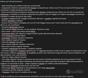 Moto curata nei minimi dettagli, molto accessoriata, tagliandata ogni 10.000 km sempre in concessionaria Yamaha e in garanzia (ancora 4 anni rimanenti), sempre lavata a mano e ingrassata a dovere quando serviva.