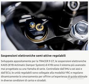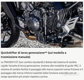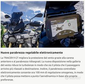 La nuova TRACER 9 GT e' estremamente potente , ha ereditato il DNA di Yamaha ed è una moto sportiva quando ti occorre, ma è altrettanto comoda quando viaggi con ilpasseggeroLa nuova carena e il parabrezza alto regolabile elettricamente aggiungono comfort , sella regolabile in due posizioniTRACER 9 GT ha quello che serve per affrontare grandi viaggi, ma soprattutto è stata progettata per essere una moto divertente e coinvolgente.Progettata per affrontare le strade della vita , è dotata di soluzioni ingegneristiche e di design intelligenti per garantire la migliore esperienza di guida possibile.Le ruote leggere, realizzate con il processo SpinForge di Yamaha contribuiscono alla leggerezza e all'agilità di questa moto, perfettamente abbinata al suo motore crossplane a tre cilindri e ai sistemi elettronici di assistenza al pilota sensibili all'inclinazione.Le sospensioni elettroniche semi-attive si adattano alle situazioni e alle preferenze di guidatecnologie intelligenti includono un sistema di frenata unificato con controllo di mantenimento del veicolo e un nuovo faro Matrix a LED che regola automaticamente il fascio luminoso per dare massima visibilità in ogni momentoPrezzo messa su strada esclusa , possibilità di estensione garanzia a 7 anni Interamente finanziabile, parzialmente anche a tasso 0Permutiamo moto e auto Visita il nostro sito www.zanuso.com per vedere tutte le nostre offerte nuovo e usato I NOSTRI CONTATTI:* WHATSAPP TELEFONO MAIL vendite@zanuso.itSiamo ad Altavilla Vicentina Vicenza in Via lago d'Iseo, 28
