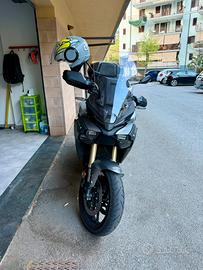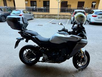 Yamaha Tracer 9 GT Y-AMT automatica 2025. Yamaha Tracer 9 GT Y-AMT automatica acquistata a maggio 2025. Colorazione ceramic ice, grigio chiaro opaco. Motore 4 tempi 3 cilindri raffreddato a liquido. Potenza massima 120cv con una coppia di 93 Nm a 7000 giri/min. L’allestimento GT include fari matrix, cruise control e limitatore della velocità, sistema di frenata intelligente con controllo di mantenimento del veicolo, sella premium, parabrezza regolabile elettronicamente, connettività bluetooth e Wi-Fi, sospensioni elettroniche semi-attive KYB, smart key, valigie laterali a sgancio rapido che contengono tranquillamente un casco jet. Oltre alla dotazione standard ed presente il bauletto posteriore da 45 litri originale Yamaha (che può contiene due caschi jet) e relativa piastra. Moto usata esclusivamente nel tragitto casa lavoro. Primo tagliando eseguito in Yamaha. Inclusi anche 7 anni di garanzia estesa e pacchetto tagliandi compreso per 3 anni. Vendo per cambio necessità, non sono interessato ad alcun tipo di scambio. Prego di contattarmi solo se realmente interessati. Offerte assurde non riceveranno risposta.