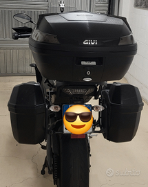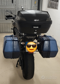 Manopole riscaldate, barra con supporto porta cellulare, deflettore su cupolino e tabella fari, bauletto posteriore e 2 bauletti laterali da 22 lt e 2 bauletti da 36 lt con relativi telaietto che si toglie in un minuto, portatarga racing che sta anche con valige.