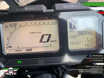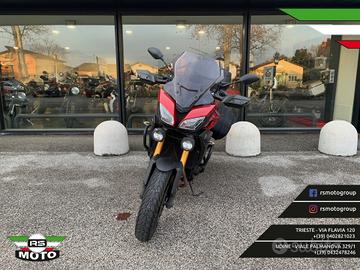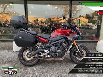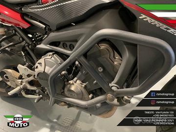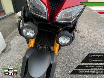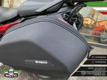 Yamaha Tracer 900 accessoriata con tris di borse Yamaha, telai paramotore e faretti supplementari.