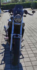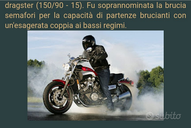 Moto in perfette condizioni, tenuta in modo impeccabile, revisionata e tagliandata, bollo pagato ( si paga al 50%) 88 euro annui, assicurazione ridotta perché iscritta come storica all' FMI, pneumatici al 50%, ho tutte le parti originali(come si vede nell' ultima foto). Non è una classica custom lenta ma una cruiser con circa 140 CV detta la brucia semafori per le sue prestazioni da dragster. Qualsiasi prova, km originali e certificati nelle varie revisioni fatte. Accetto in permuta solo scooter minimo 500 di cilindrata, di marca giapponese o tedesco )non posso descrivere specificamente) con pochi km .