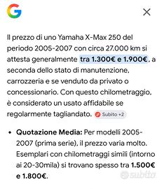 Vendo Yamaha X-Max 250 immatricolato 06/2006, con circa 26/27.000 km. Scooter sempre tenuto in garage, usato con cura da mio papà (pensionato appassionato), mai incidentato e in buone condizioni generali per età e chilometraggio. Mezzo molto comodo, affidabile e ancora attuale come praticità e protezione. È fermo da circa 1 anno per inutilizzo, purtroppo ha batteria scarica, quindi viene venduto nello stato in cui si trova, con formula visto e piaciuto. Dati principali: Yamaha X-Max 250 Immatricolazione: 06/2006 Km: circa 26/27.000 Alimentazione: benzina Mai incidentato Sempre in garage Cod. Infobike: 0001738 Zona Bassano del Grappa Prezzo richiesto: € 1.000 trattabili. Solo realmente interessati, no perditempo.