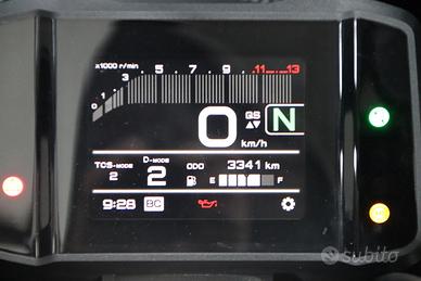 Moto in condizioni di pari al nuovo, supre-accessoriata: cupolino frontale + carenatura inferiore + porta-targa sportivo + frecce led plus + sensore pressione pneumatici + griglia radiatore + specchietti a manubrio + leve frizione e freno ricavate dal pieno + pedane poggia-piedi ricavate dal pieno + nottolini cavalletto post. + adesivi serbatoio