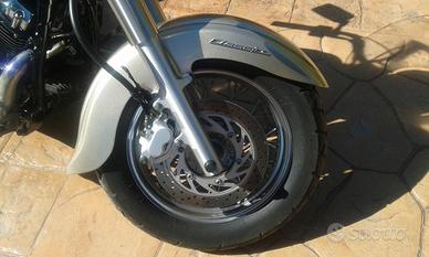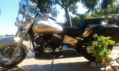 Motocicletta custom in condizioni perfette, usata solo per brevi passeggiate. Accessoriata di borsoni in pelle, schienale per il passeggero e cupolino proteggi vento in metaclilato ad alto impatto.