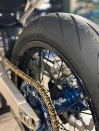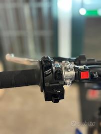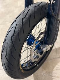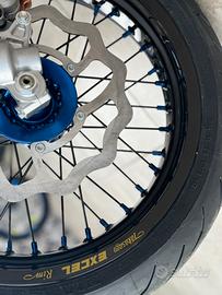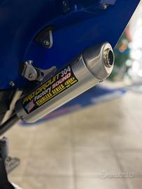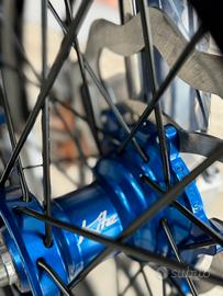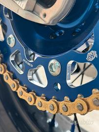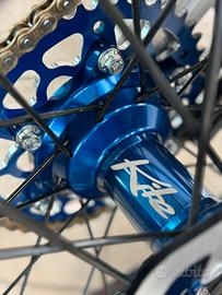 Ruote complete Kite personalizzate con mozzi ergal blu, raggi neri e nipple blu, canali Excel, pneumatici Pirelli diablo rosso, corona moto master 44 denti, catena Did oro, pignone 14 denti cht, espansione Procircuit works limited factory, silenziatore Procircuit R304, parafango anteriore Yz 85, dischi freno Galfer, fanale anteriore racetech V face led, porta targa posteriore racetech led con targa estraibile, tachimetro digitale koso, cavalletto laterale.