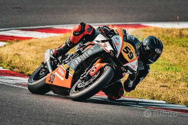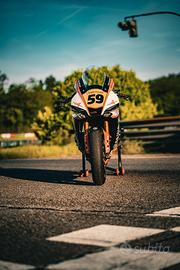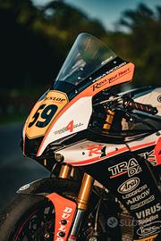 La moto è allestita per partecipare alle gare nazionali, quindi conforme al RTGS (legature, vaschette, pinna, protezioni, ecc)