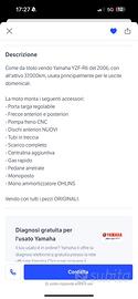 Come da titolo vendo Yamaha YZF-R6 del 2006, con all'attivo 40.000km, usata principalmente per le uscite domenicali. La moto monta i seguenti accessori: - Porta targa regolabile - Frecce anteriori e posteriori - Pompa freno CNC - Dischi anteriori NUOVI - Tubi in treccia - Scarico completo - Centralina aggiuntiva - Gas rapido - Monoposto - Mono ammortizzatore OHLINS Vendo con tutti i pezzi ORIGINALI. Possibilità di scambio con Honda Africa Twin Prezzo leggermente trattabile