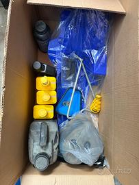 Insieme ci sono 4 filtri dell’aria, olio per oliaggio filtri, olio per tagliandi, liquido per lavaggio filtri, coperchio cassa filtro e il tappo marmitta