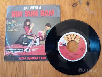 Vendo 3 bellissimi vinili a 45giri tutti della Five, della trasmissione televisiva Bim Bum Bam. Il primo del 1986, dai titoli Tutti Insieme Noi Guardiamo Four & Giorgia Ciao Ciao, il secondo del 1987, dai titoli Dai, Vieni a Bim Bum Bam & Ciao Ciao Gioca con Noi, & il terzo del 1988 dai titoli Siamo qui tutti & 3 & Siamo Tutti Tuoi Amici, tutti in ottime condizioni (vedi foto). Spese di spedizione a carico di chi acquista.