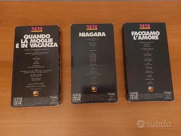 VENDO 3 Videocassette su Marilyn Monroe, l'Unità, 1997. I titoli dei film sono "Quando la moglie è in vacanza", "Niagara" e "Facciamo l'amore". Le VHS sono COME NUOVE e perfettamente funzionanti. Le custodie esterne hanno lievi segni di usura sui bordi dovuti al tempo. Prezzo 5 euro. Posso spedire.