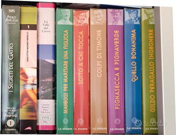 79 Videocassette originali VHS: film vari, teatro (Gilberto Govi), serie TV (Montalbano). Le cassette sono tutte in ottimo stato. Sono state usate pochissimo molti anni fa e sempre conservate al chiuso in un armadio. Il peso totale supera i 20 Kg massimi. Si accettano quindi proposte per un numero inferiore di cassette