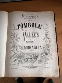 Sono 15 spartiti di valzer e polke per pianoforte da eseguirsi a due o quattro mani che risalgono al 1850-1900 alcuni tratti da operetta altri sono pezzi originali a diffusione locale pubblicati dalle principali case editrici musicali dell'epoca. Negli anni '60 sono stati rilegati per preservarli dal degrado, sono perfettamente conservati e leggibili, Di seguito riporto l' elenco e, quando possibile, la data di stampa. 1)Les Americaines. Suite de valses compose' par F. Wagner. Ed. Ricordi 1899 2)Tre fiori di primavera. Piccolo album danzante per pianoforte a quattro mani. Di Giovanni Quirici.Ed.G.Martinenghi Milano 3)Valzer-bouquet di Giovanni Strauss op. n. 43335 manca il frontespizio. 4)La capricciosa(mazurka) Augurio(polka) di Emilio Azzo. Ed. Stabilimento della Società editrice Milano. 5)Foglie cadenti, valzer per pianoforte a quattro mani di Marco Sala(1842-1901) op. 67 ed. Tito di G. Ricordi.1870 6)Aggradite(bitte schon) polka per pianoforte sopra i motivi dell'operetta Cagliostro a Vienna di G. Strauss op. 372 ed. Ricordi 1875. Sono due copie. 7)Cagliostro,valzer composti sopra motivi della sua operetta da G. Strauss op. 370 ed. Ricordi. 8)Budweiser,Pilsner e Prachimer Polka di Joseph Liehmann maestro di cappella del reggimento del barone Palombini, ed. originale austriaca e molto vecchia. 9)Ispirazione sulle amene rive del fiume Olona, valzer brillante di Giovanni Martinenghi, ed. G. Martinenghi Milano1866 10)Tombola!!valzer per pianoforte di G. Moraglia ed. Martinenghi Milano 11)L'amor di Patria, polka di Antonio Canti ed. Giovanni Canti, Milano e Firenze. 12)Alla Marchesina di Balzola e Coniolo madamigella Luigia Fassati Polka-Mazurka per pianoforte di Francesco Pezzoli ed. Milano presso G. Canti 13)Alla caccia (Auf der jagd) galop per pianoforte sopra i motivi dell'operetta Cagliostro a Vienna di G. Strauss op. 373 ed. Ricordi 14)La Provvidenza, grazioso pensiero per pianoforte di Giovanni Martinenghi op. 104 ed. G. Martinenghi Milano.
