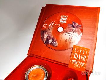 Scatola Merry Silver Christmas Bagutta contenente un cofanetto con CD audio per ascoltare 10 famose canzoni di Natale. 2 tappi per vino o spumante con 2 simpatici Babbo Natale decorati in argento e 2 portacandela con candele anch'essi decorati in argento. Ideale per immergersi nell'atmosfera del Natale con le musiche di sottofondo e arricchire una bella tavola a tema natalizio coi vostri bambini.