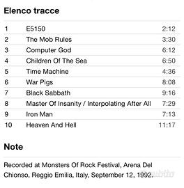 CD live ( bootleg) registrato al Monsters of Rock di Reggio Emila del 12 settembre 1992 con la voce di RONNIE JAMES DIO. Come tutti i bootlegs degli anni 90 e’ fuori dai canali tradizionali di vendita e difficile da trovare.