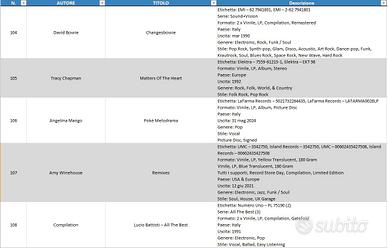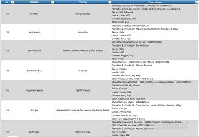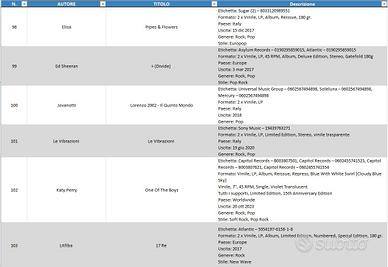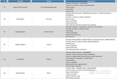 Vendo il seguente blocco composto da n.36 dischi vinili LP. In seguito alcuni dei cantanti presenti nel blocco: Emma, Sangue Misto, Adele, Amy Winehouse, Jovanotti, Katy Perry, Pinguini Tattici Nucleari, Harry Styles, Claudio Baglioni, Imagine Dragons, Kylie Minogue, Everything But The Girl, George Michael & Wham!, Negramaro, Boomdabash, Bomfunk MC's, Giorgia, Lady Gaga, Elisa, Ed Sheeran Jovanotti, Le Vibrazioni, Litfiba, David Bowie, Tracy Chapman, Angelina Mango, Amy Winehouse Per i dettagli vedere la lista nelle foto pubblicate. Disponibile a vendere singoli pezzi oppure l'intero blocco. **SOLO CONSEGNA A MANO**