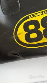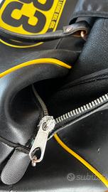 Il borsone é capiente, ideale per uso quotidiano o sportivo, e riporta logo e grafica ufficiale 883. Usato, presenta segni di usura, con alcuni danni visibili nella cerniera e nella parte esterna, come mostrato nelle foto, che testimoniano la sua autenticità e storia.