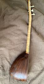 Mandolino turco, in legno, lunghezza totale 78cm, cassa 25cm. Divwrse corde di ricambio, con cuatodia