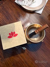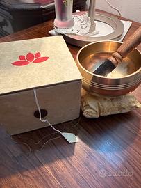 Campana tibetana in ottone con batacchio, cuscino e scatola originale.